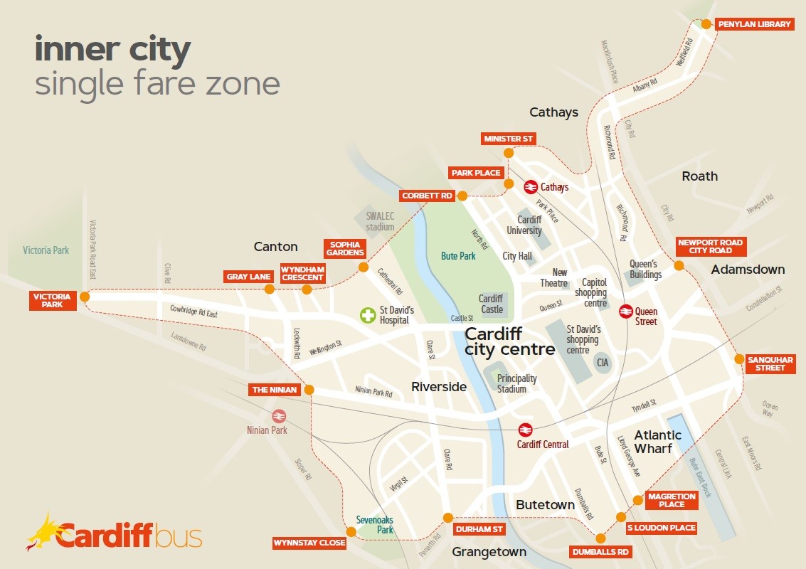 And finally, there are 3 designated fare zones in the city where you’ll pay 50p less per single ticket if you’re travelling with them: City Centre, Ely, and Pontprennau / Pentwyn / Llanedeyrn. The City Centre zone is pretty big – it stretches from Victoria Park in the west to Adamsdown in the east, and Penylan in the north to Dumballs Road in the south.